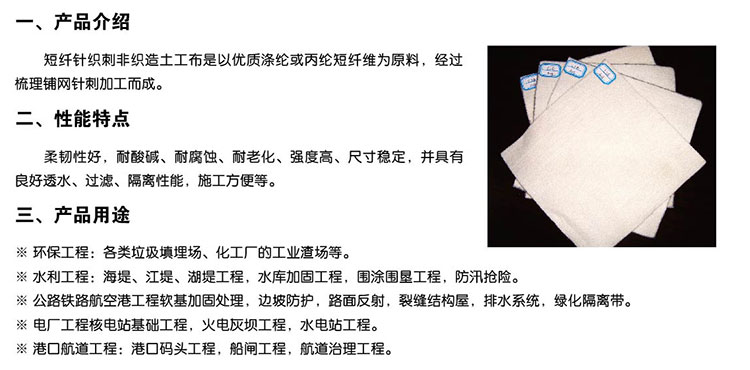 5、短纖土工布產(chǎn)品不含化學(xué)添加劑,也不經(jīng)熱處理,是環(huán)保型的建筑材料。